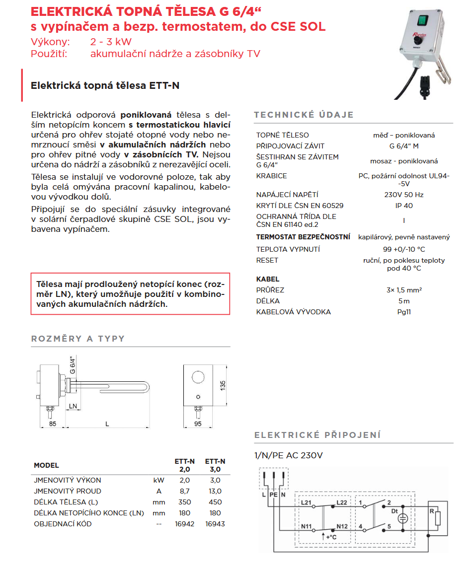 Poniklované elektrické topné těleso G 6/4" s termostatickou plastovou hlavicí 1x230 V pro připojení do solární čerp. skupiny CSE SOL, s vypínačem a dvoupólovým havarijním termostatem, 5m přívodní 3žilový kabel s konektorem, poniklované tělěso - vhodné do otopné i pitné vody, delší netopící konec pro nádrže DUO, HSK.