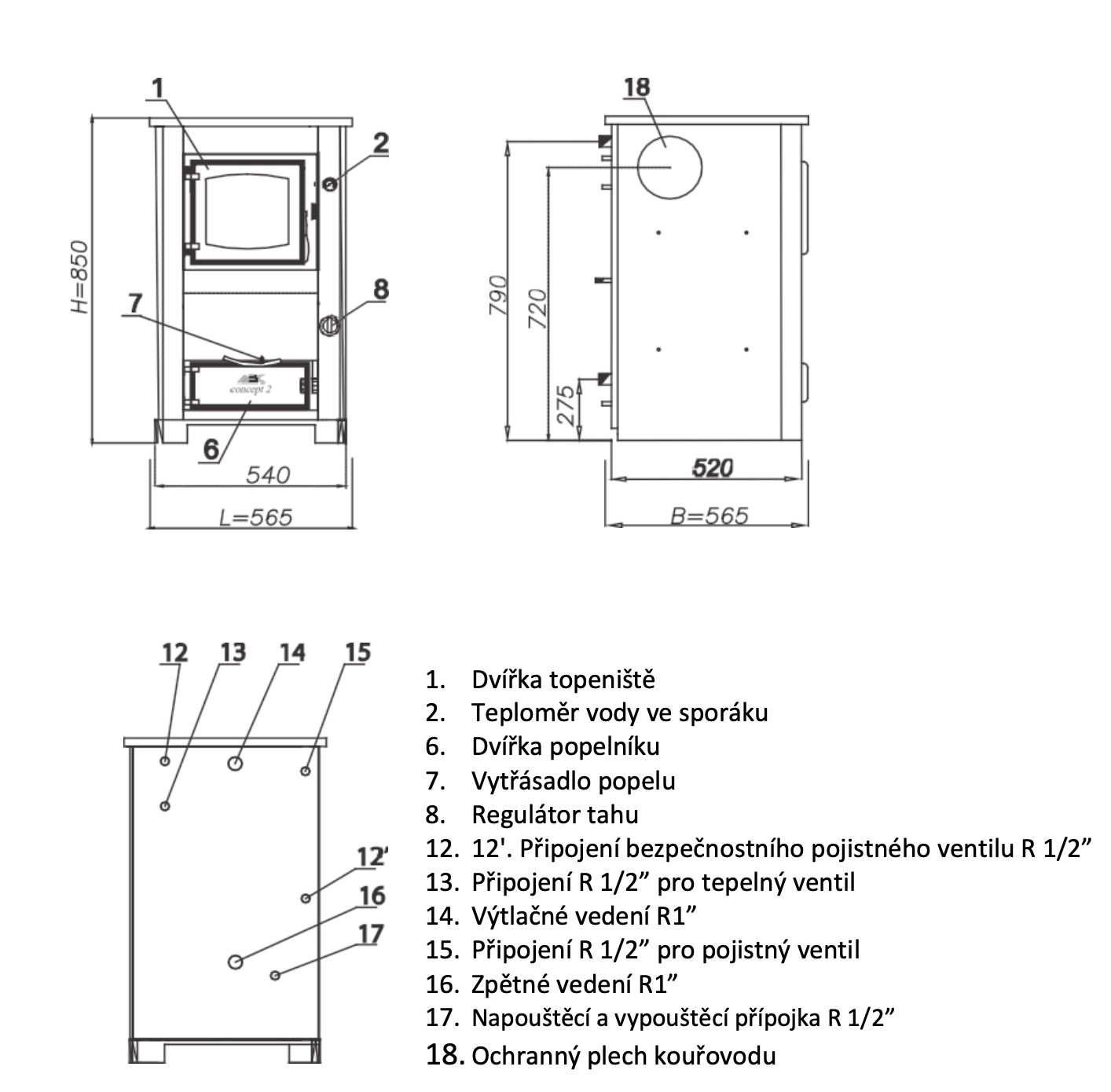 V místě napojení na komín mohou být kamna levá nebo pravá (napojení z boku) s možností napojení přes varnou desku. Sporáky Concept 2 mini jsou univerzální levá, pravá a s možností připojení přes plotnu. Před napojením na komín je nutné sundat plech bočního krytu, a následně sundat ochranný plech z kouřovodu (na levé nebo pravé straně, podle toho, jakou stranu zvolíte pro napojení na komín), Obr. 2, pozice č. 18. Standardní připojení na náš sporák je 150 mm.