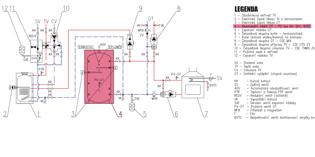Nádrž určená k akumulaci a následné distribuci tepelné energie z kotlů na pevná paliva, tepelných čerpadel případně jiných zdrojů tepla. Nádrž má 5 návarků G 6/4" pro připojení tepelných zdrojů a zátěží nebo vložení el. topných těles.