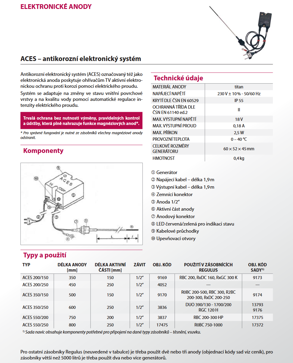 Antikorozní elektronický systém (ACES) označovaný též jako elektronická anoda poskytuje ohřívačům TV aktivní elektronickou ochranu proti korozi pomocí elektrického proudu. Systém se adaptuje na změny ve stavu vnitřní povrchové vrstvy a na kvalitu vody pomocí automatické regulace intenzity elektrického proudu. Zajišťuje trvalou ochranu bez nutnosti výměny, pravidelných kontrol a údržby. Plně nahrazuje funkce hořčíkových anod. Obsahuje anodu 350/250 a redukci 3/4"x1/2" M/F.