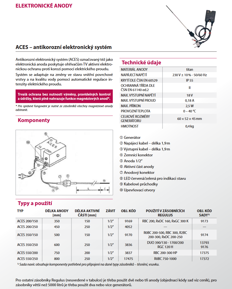 Antikorozní elektronický systém (ACES) označovaný též jako elektronická anoda poskytuje ohřívačům TV aktivní elektronickou ochranu proti korozi pomocí elektrického proudu. Systém se adaptuje na změny ve stavu vnitřní povrchové vrstvy a na kvalitu vody pomocí automatické regulace intenzity elektrického proudu. Zajišťuje trvalou ochranu bez nutnosti výměny, pravidelných kontrol a údržby. Plně nahrazuje funkce hořčíkových anod. Obsahuje anodu 550/200, 200/150, elektroniku, propojovací kabel, vsuvky, těsnění.