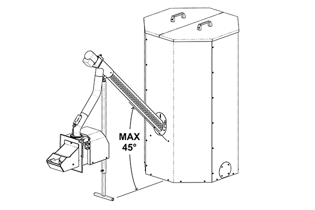 Ke každému dopravníku je dodávána podpěrná noha. Její délku nastavíme tak, aby byl úhel dopravníku maximálně 45° a hadice byla napnutá.