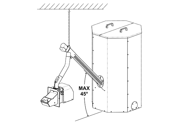 – zavěšení od stropu – ve stísněných prostorech doporučujeme nohu nahradit řetízkem (součástí dodávky dopravníku), na který zavěsíme dopravník od stropu. Její délku nastavíme tak, aby byl úhel dopravníku maximálně 45° a hadice byla napnutá.
