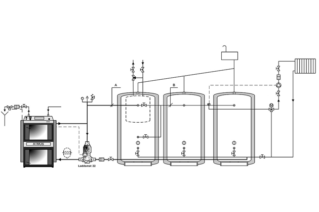 Kotle ATMOS musí být zapojeny s LADDOMATEM 22 nebo termoregulačním ventilem (trojcestným ventilem ovládaným servopohonem) pro docílení minimální teploty vratné vody do kotle 65 °C. Výstupní teplota kotle musí být trvale udržována v rozsahu 80 – 90 °C.