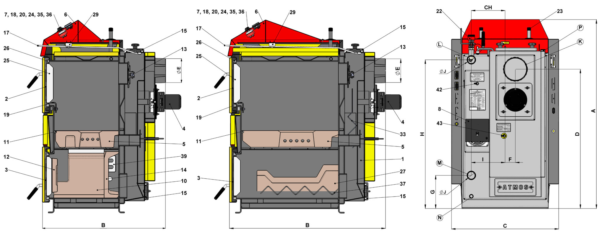 ysokou účinností při ekologicky šetrném spalování. V zadní části tělesa kotlů je svislý spalinový kanál, opatřený ve vrchní části zatápěcí záklopkou. Vrchní část spalinového kanálu je opatřena odtahovým hrdlem pro připojení na komín.