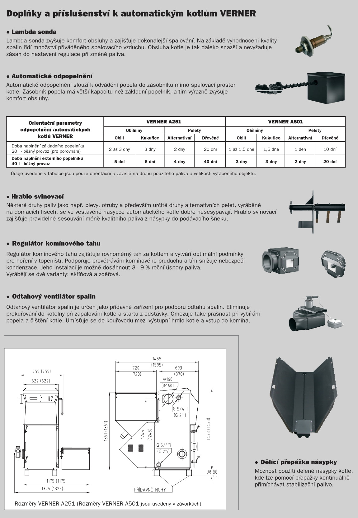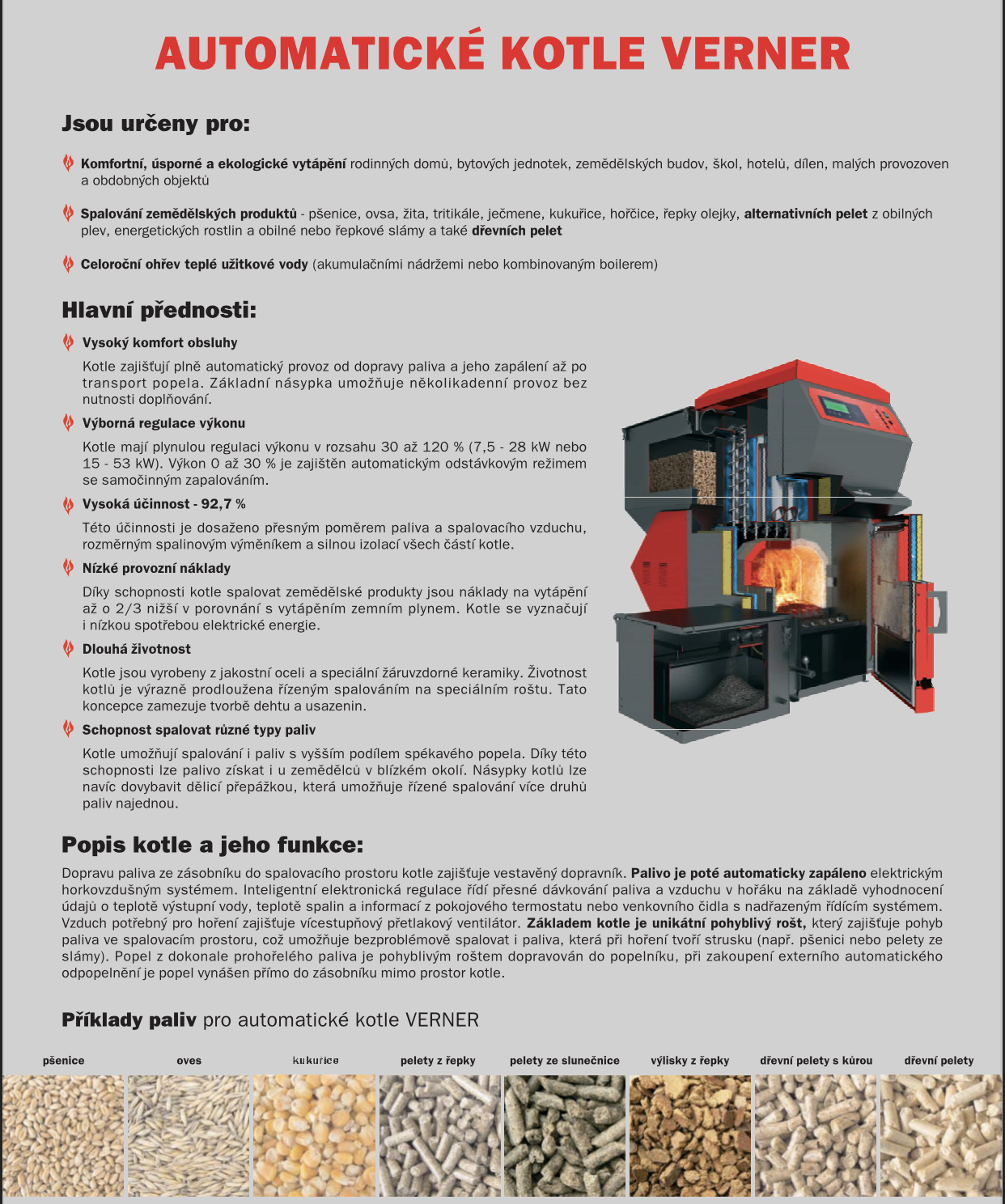Automatický kotel VERNER o výkonu 25 kW (7,5 – 28 kW) je určen pro komfortní, úsporné a ekologické vytápění rodinných domů, bytových jednotek, zemědělských budov, škol, hotelů, dílen, malých provozoven a obdobných objektů.
