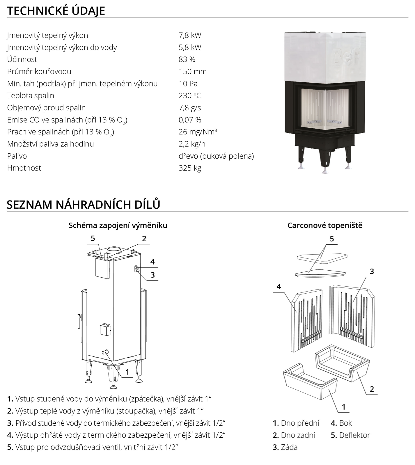 Díky ohništi vyloženému akumulační výstelkou, Carconem, který byl vyvinut speciálně pro naši firmu, je dosaženo vysoké čistoty a účinnosti spalování a příjemného pohledu do ohně. Tělo krbové vložky je pokryto izolací a vložka má dvojité prosklení již ve standardu. I díky tomu je dosaženo maximální efektivity tepla předaného do výměníku.