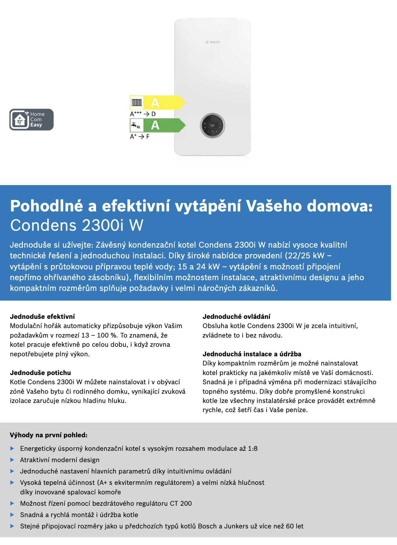 - vysoká tepelná účinnost (A+ s ekvitermním regulátorem) a velmi nízká hlučnost
