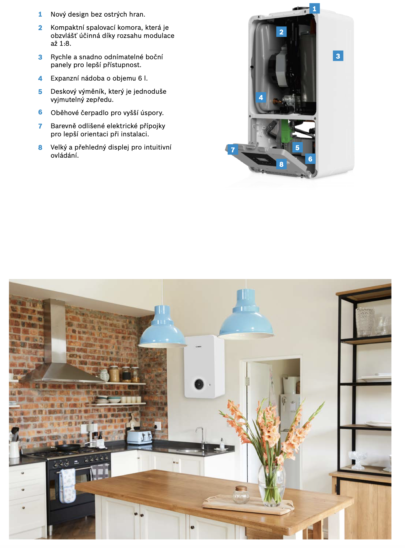 - energeticky úsporný kondenzační kotel s vysokým rozsahem modulace až 1:8