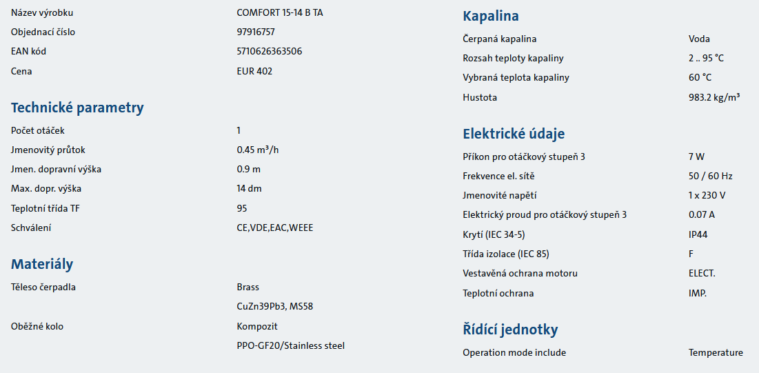 Čerpadlo cirkulační Grundfos závitové COMFORT 15-14 B TA PM, Rp 1/2", 80mm 1x230V, PN10