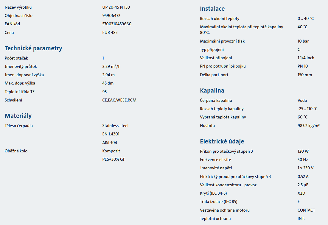 Čerpadlo cirkulační Grundfos závitové UP 20-45 N 230V, PN10
