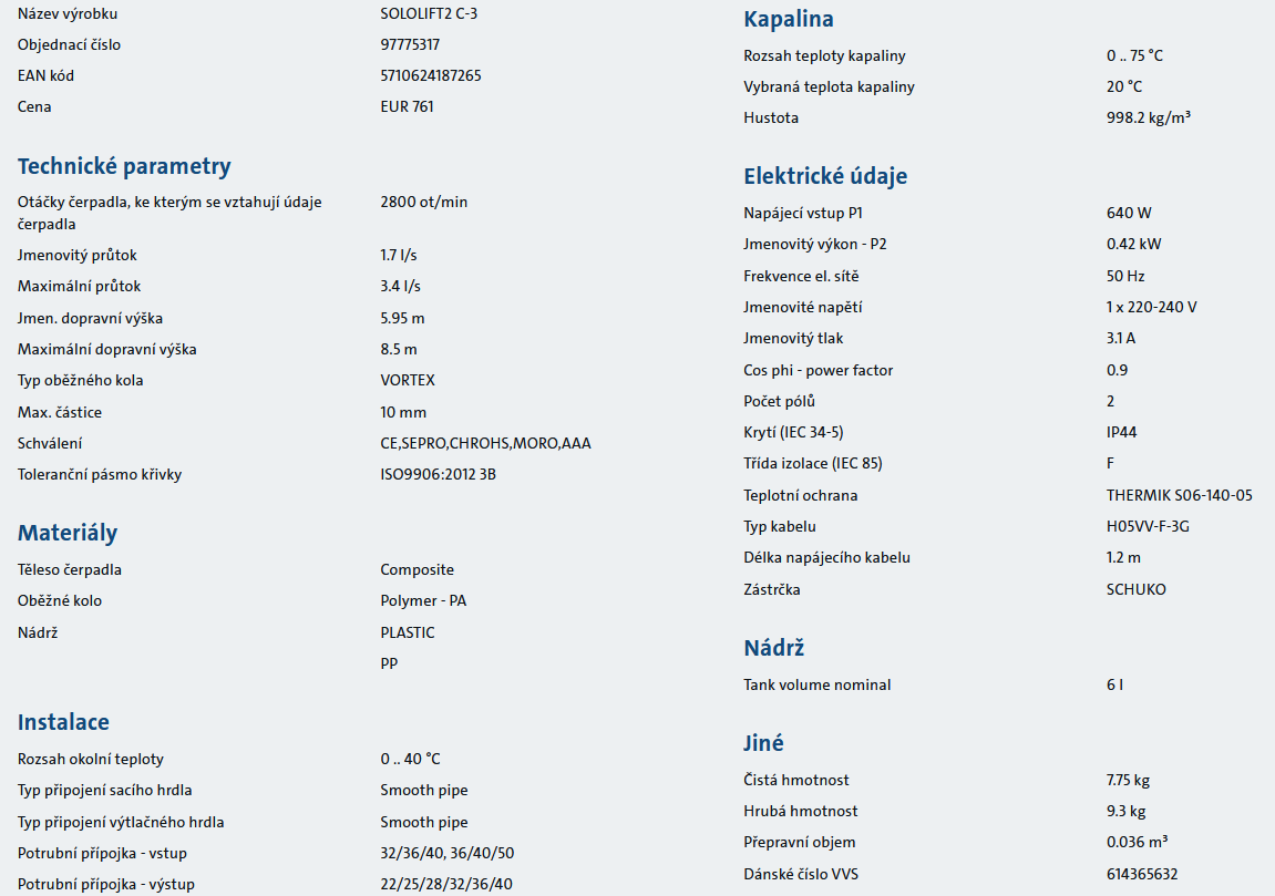 Čerpadlo kalové Grundfos - Sololift2+ C-3 (pračka, myčka,dřez, vany, sprcha, umyvadlo) 230V