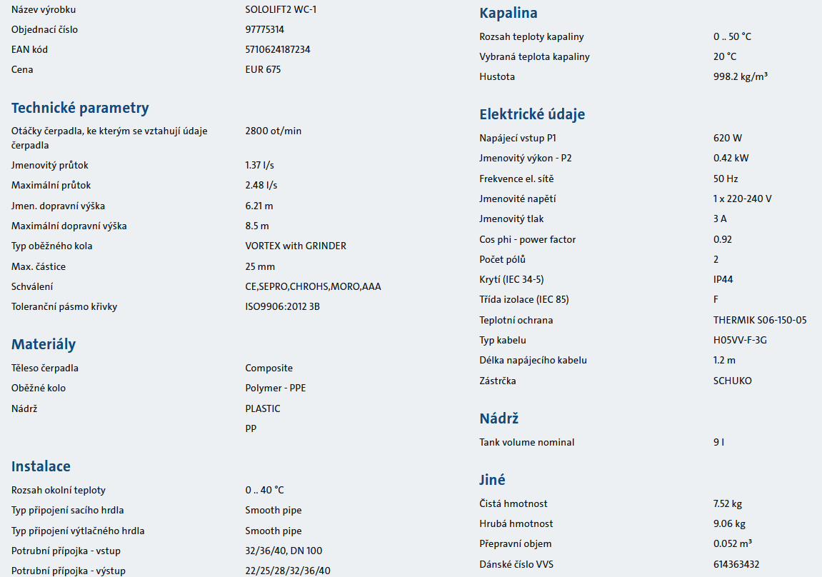 Čerpadlo kalové Grundfos - Sololift2+ WC-1 (WC) 230V