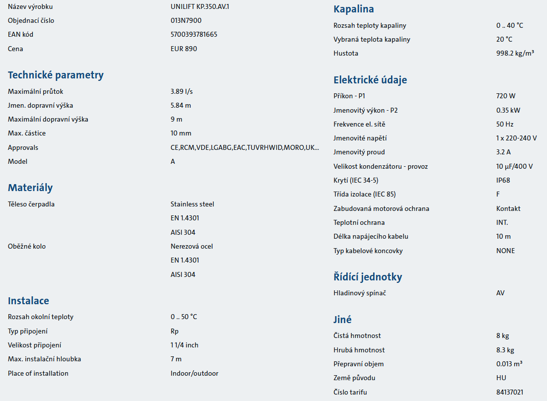 Čerpadlo kalové Grundfos - Unilift KP 350 AV1, s vertikálním plovákem, kabel 10m 230V