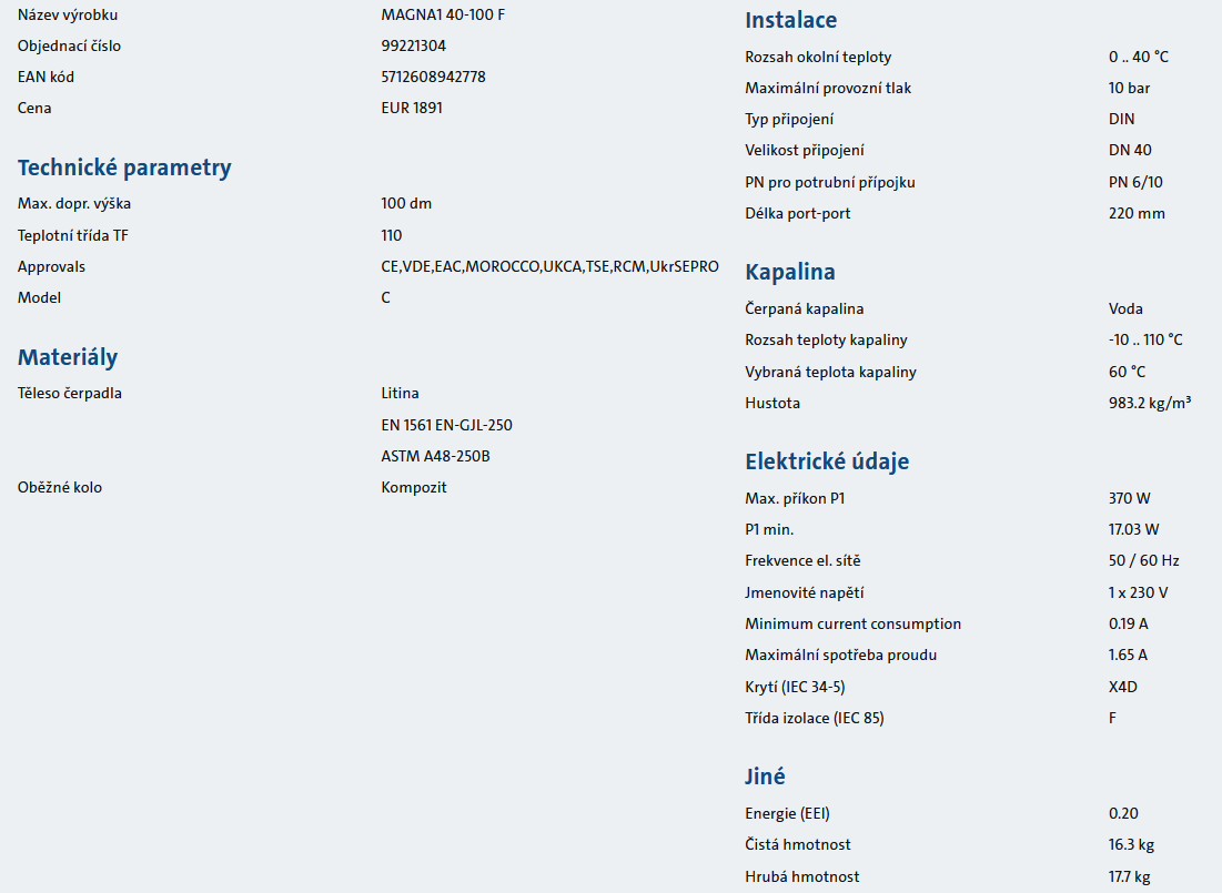 Čerpadlo oběhové Grundfos přírubové MAGNA1 40-100 F, 220mm 1x230V, PN6/10