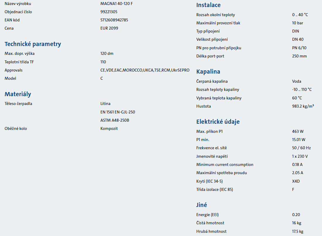 Čerpadlo oběhové Grundfos přírubové MAGNA1 40-120 F, 250mm 1x230V, PN6/10