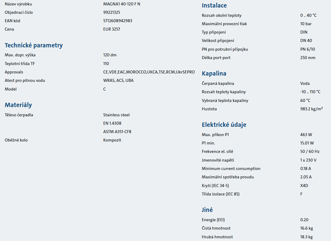 Čerpadlo oběhové Grundfos přírubové MAGNA1 40-120 F, N 250mm 1x230V, PN6/10
