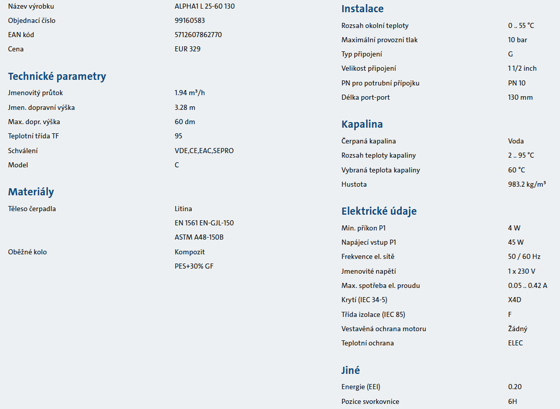 Čerpadlo oběhové Grundfos závitové ALPHA1 L 25-60, 130mm 1x230V, PN10