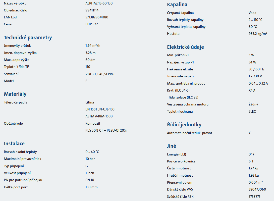 Čerpadlo oběhové Grundfos závitové ALPHA2 15-60, 130mm 1x230V, PN10