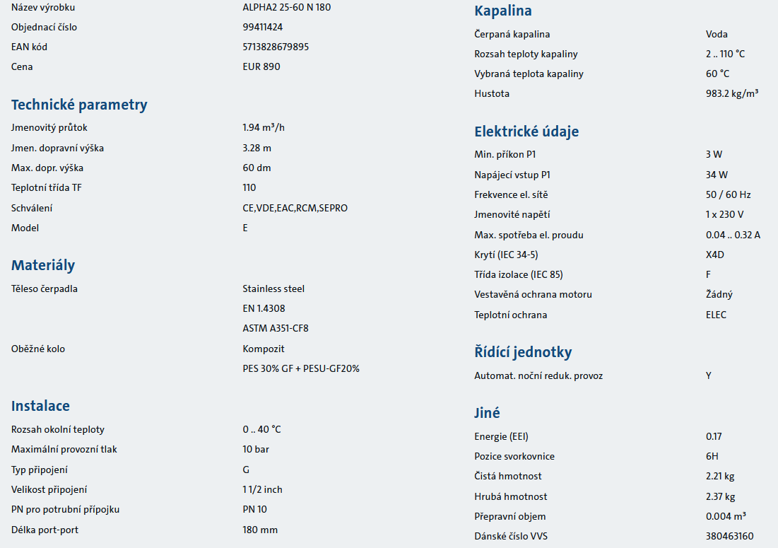Čerpadlo oběhové Grundfos závitové ALPHA2 25-60 N, 180mm 1x230V, PN10 nerez