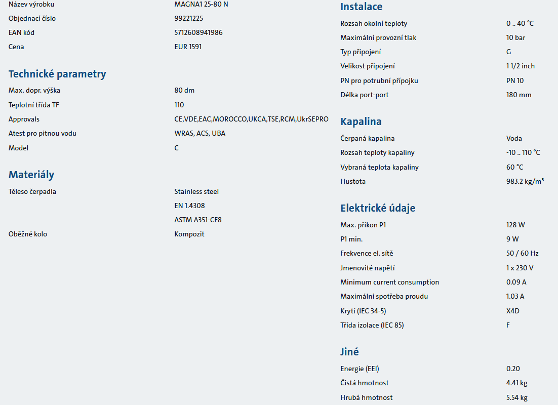 Čerpadlo oběhové Grundfos závitové MAGNA1 25-80 N, 180mm 1x230V, PN10 nerez