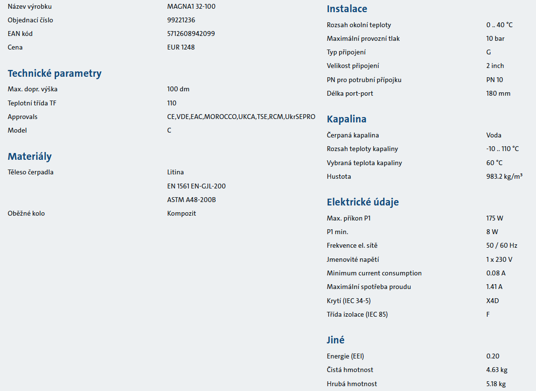 Čerpadlo oběhové Grundfos závitové MAGNA1 32-100, 180mm 1x230V, PN10