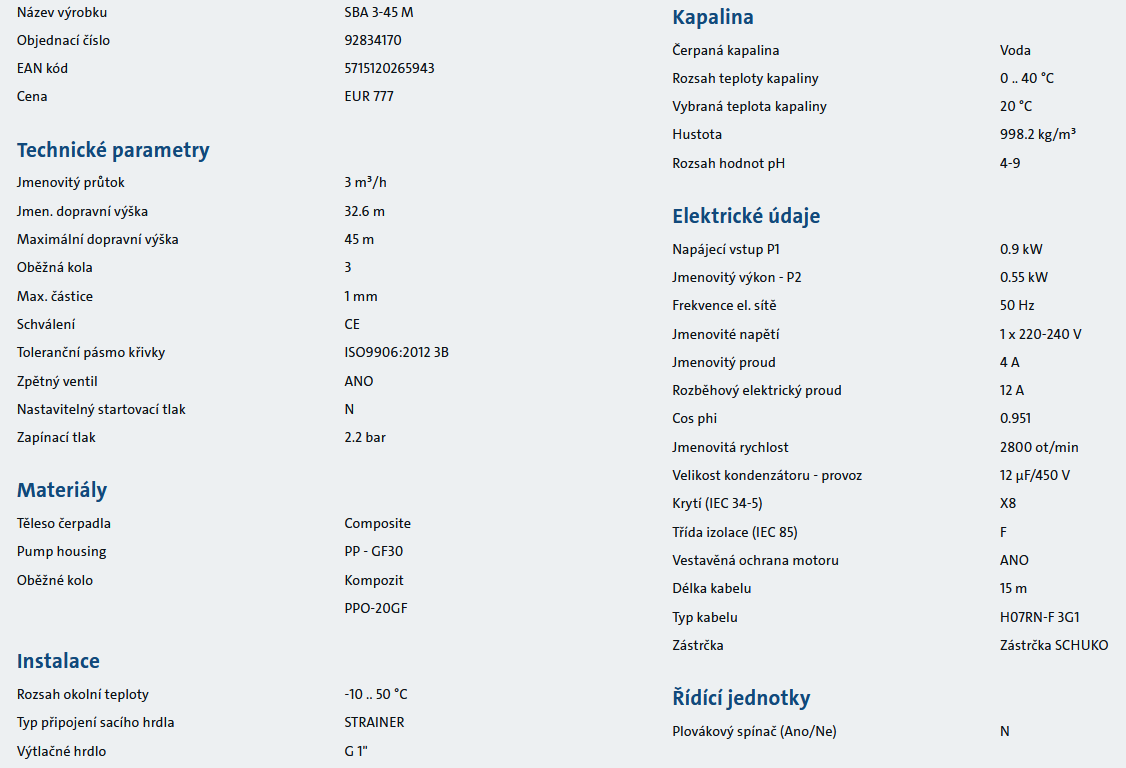 Čerpadlo ponorné Grundfos - SBA 3-45 M NEW, s 15m kabelem (s řídící jednotkou) 230V