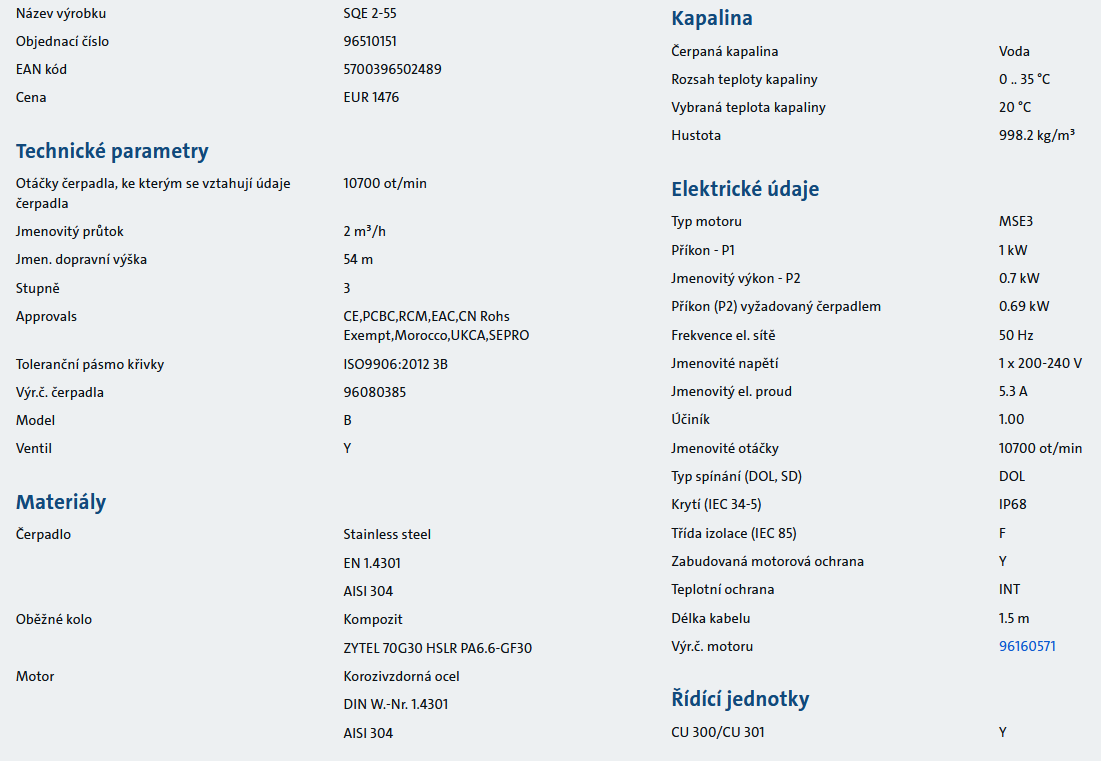 Čerpadlo ponorné Grundfos - SQE 2-55 s kabelem 40m (komplet), 230V