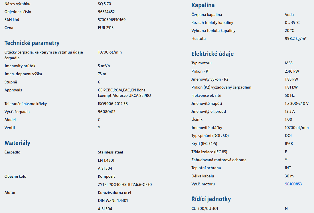 Čerpadlo ponorné Grundfos - SQE 5-70 s kabelem 40m (komplet), 230V