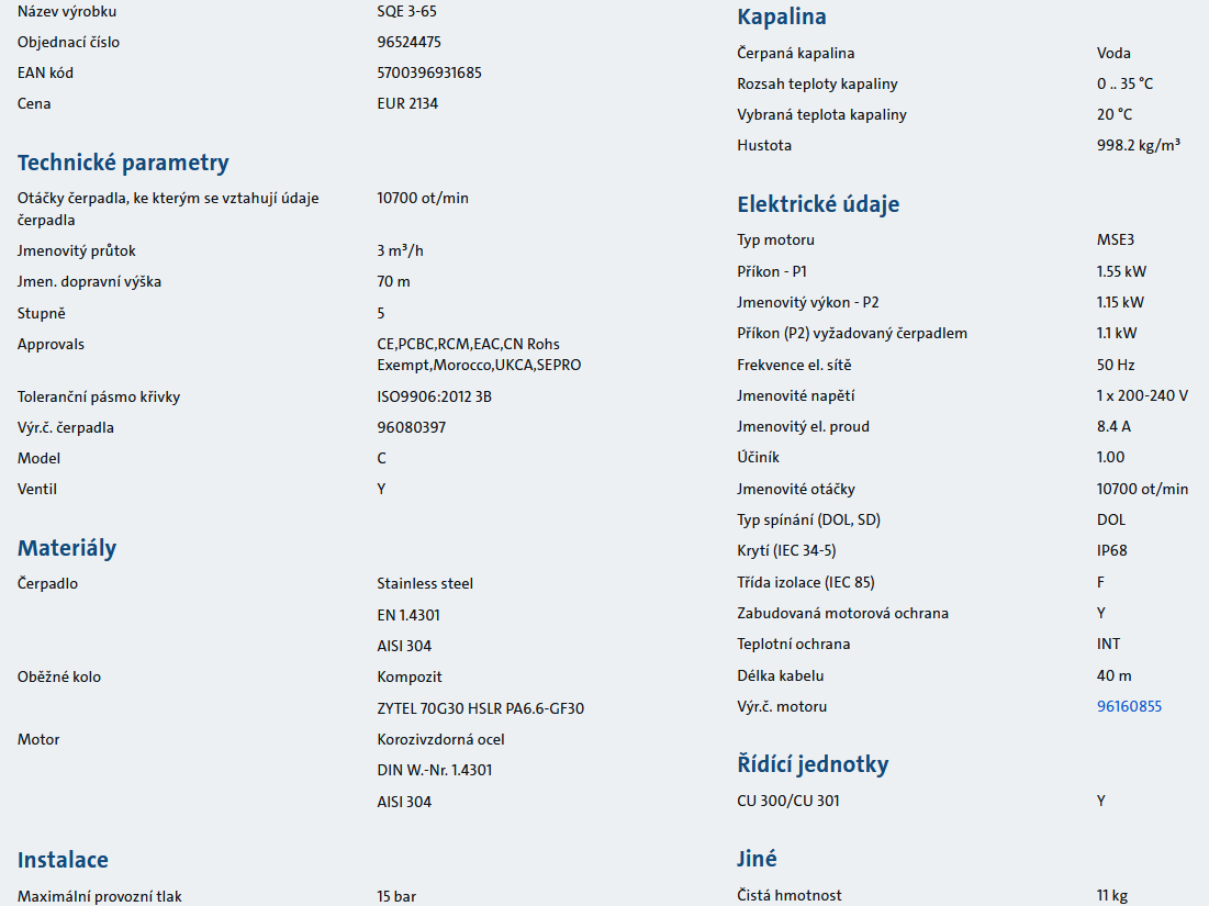 Čerpadlo vodárna Grundfos - SQE 3-65 s kabelem 40m (komplet), 230V