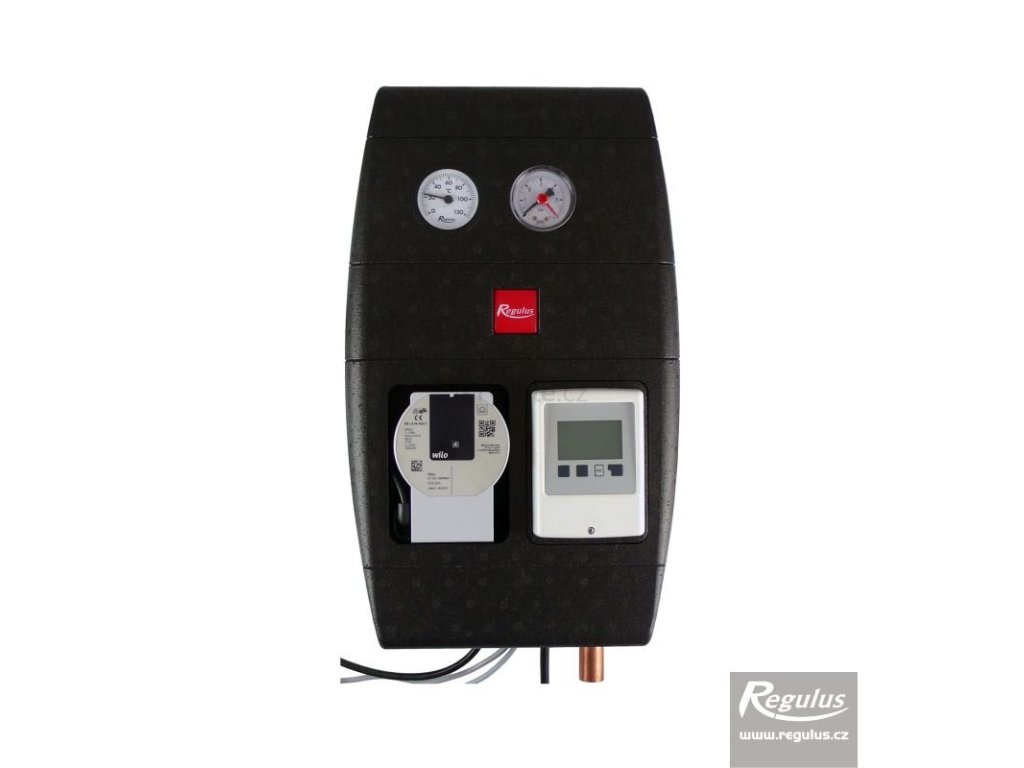 Čerpadlová skupina s integrovaným regulátorem pro řízení solárního systému. Regulátor plynule řídí otáčky čerpadla a na displeji zobrazuje průtok solárním systémem. Součástí čerpadlové skupiny je speciální zásuvka s výstupním napětím 230 V pro připojení topného tělesa o výkonu až 3 kW. Zásuvka je spínána regulací podle teploty v zásobníku, časového programu a podle dispozice nízkého tarifu signálu HDO.