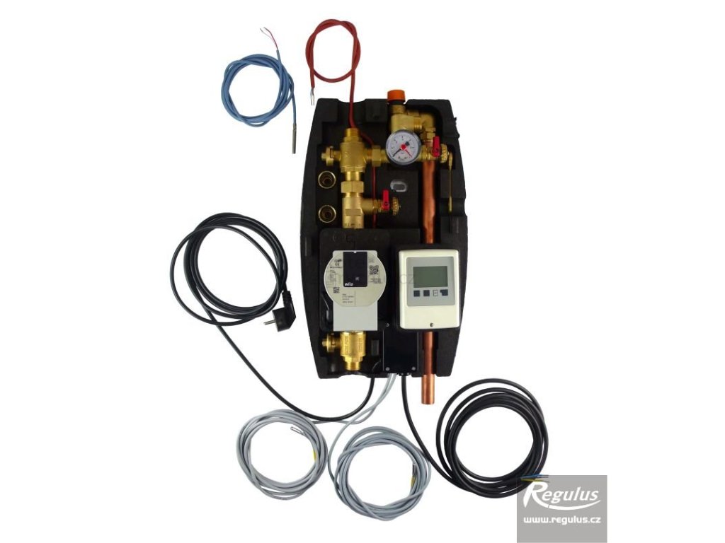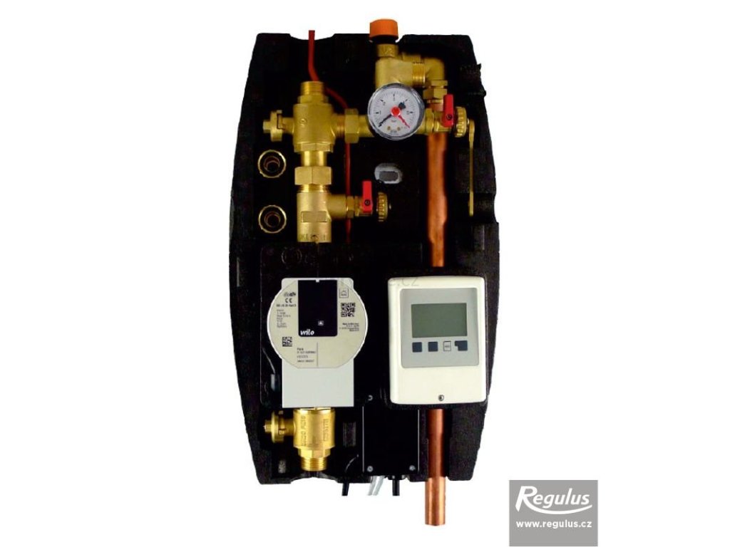 Čerpadlová skupina s integrovaným regulátorem pro řízení solárního systému. Regulátor plynule řídí otáčky čerpadla a na displeji zobrazuje průtok solárním systémem. Součástí čerpadlové skupiny je speciální zásuvka s výstupním napětím 230 V pro připojení topného tělesa o výkonu až 3 kW. Zásuvka je spínána regulací podle teploty v zásobníku, časového programu a podle dispozice nízkého tarifu signálu HDO.