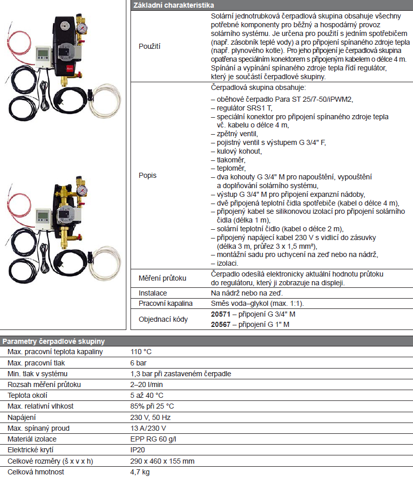 Obsahuje zásuvku pro spínání doplňkového zdroje (kotle), kabel s konektorem pro ovládání zdroje a 2 zapojená čidla do zásobníku. Obsahuje elektronické měření průtoku zobrazené na displeji.