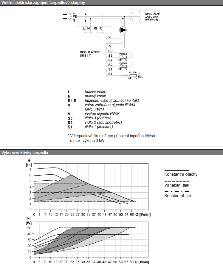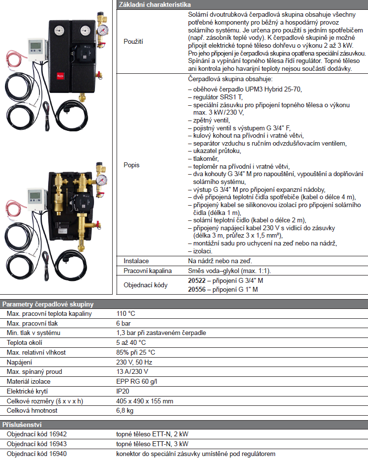 Obsahuje zásuvku s výstupním napětím 230 V pro připojení topného tělesa o výkonu až 3 kW, spínanou regulací, a 2 zapojená čidla do zásobníku. Typy s čerpadlem Grundfos obsahují mechanický průtokoměr. Typy s čerpadlem Wilo obsahují elektronické měření průtoku zobrazené na displeji.