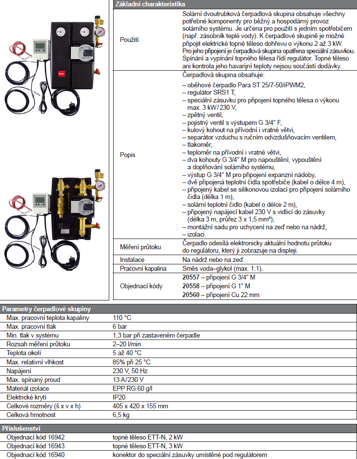 Obsahuje zásuvku s výstupním napětím 230 V pro připojení topného tělesa o výkonu až 3 kW, spínanou regulací, a 2 zapojená čidla do zásobníku. Typy s čerpadlem Grundfos obsahují mechanický průtokoměr. Typy s čerpadlem Wilo obsahují elektronické měření průtoku zobrazené na displeji.