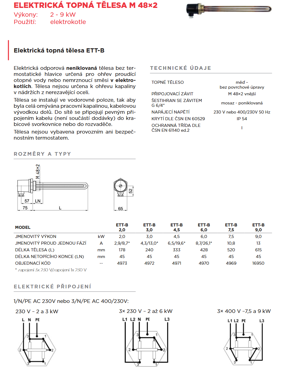 Elektrické odporové neniklované těleso bez termostatické hlavice určené pro ohřev proudící otopné vody nebo nemrznoucí směsi v elektrokotlích. Do sítě se připojuje pevným připojením kabelu (není součástí dodávky) do krabicové svorkovnice nebo do rozvaděče.