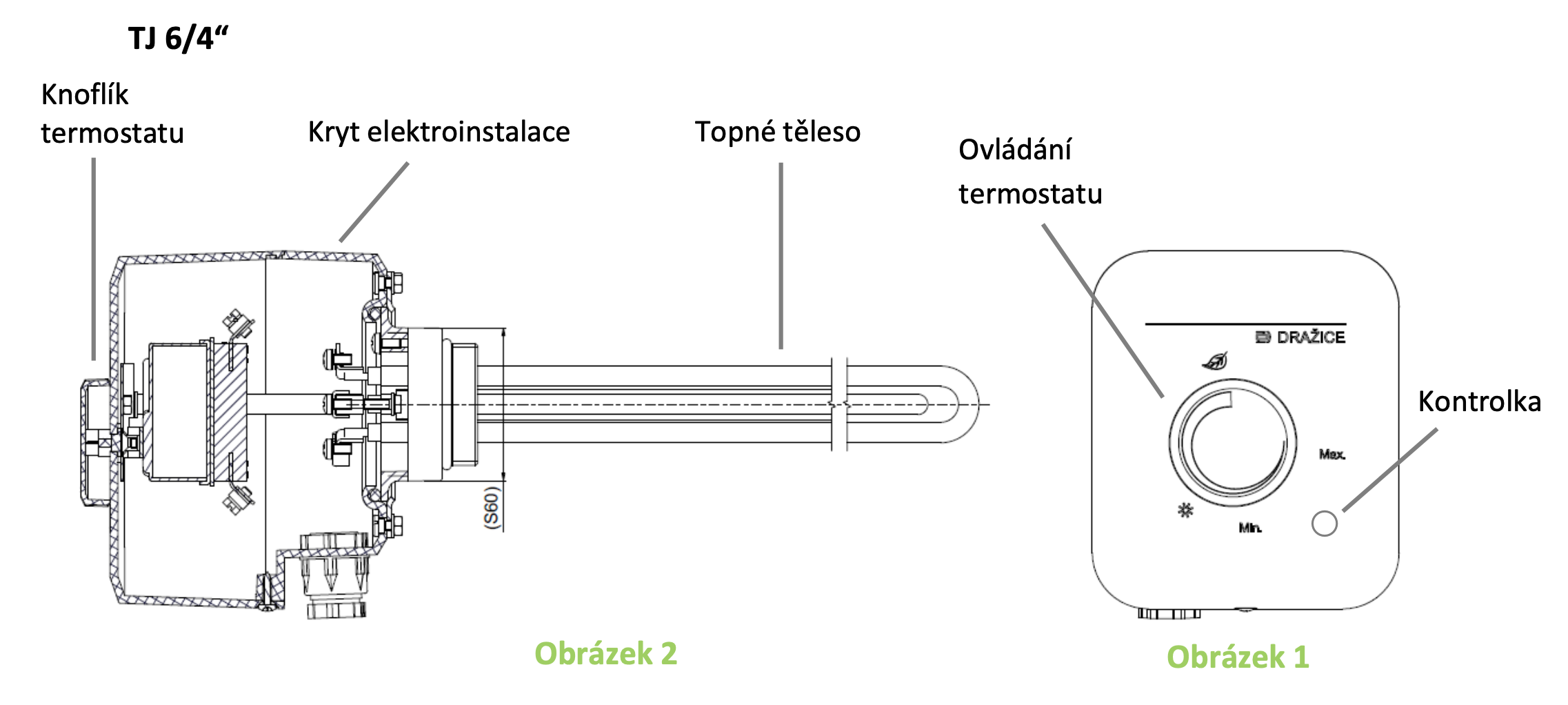 Vodu ohřívá trubkové topné těleso. V jímce jsou umístěna čidla bezpečnostního a provozního termostatu (oba přístroje jsou v jednom bloku). Provozní termostat řídí nastavenou teplotu vody. Při jeho poruše vypne bezpečnostní termostat přívod elektrické energie ve všech pólech v teplotním rozsahu 0 - 90 °C.