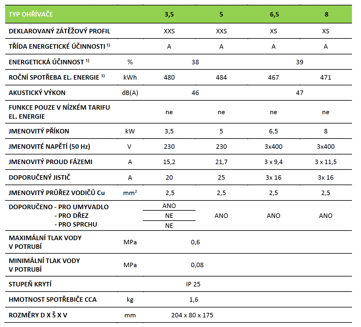 - S topnými tělesy o výkonu 3,5 kW, 5 kW, 6,5 kW a 8 kW