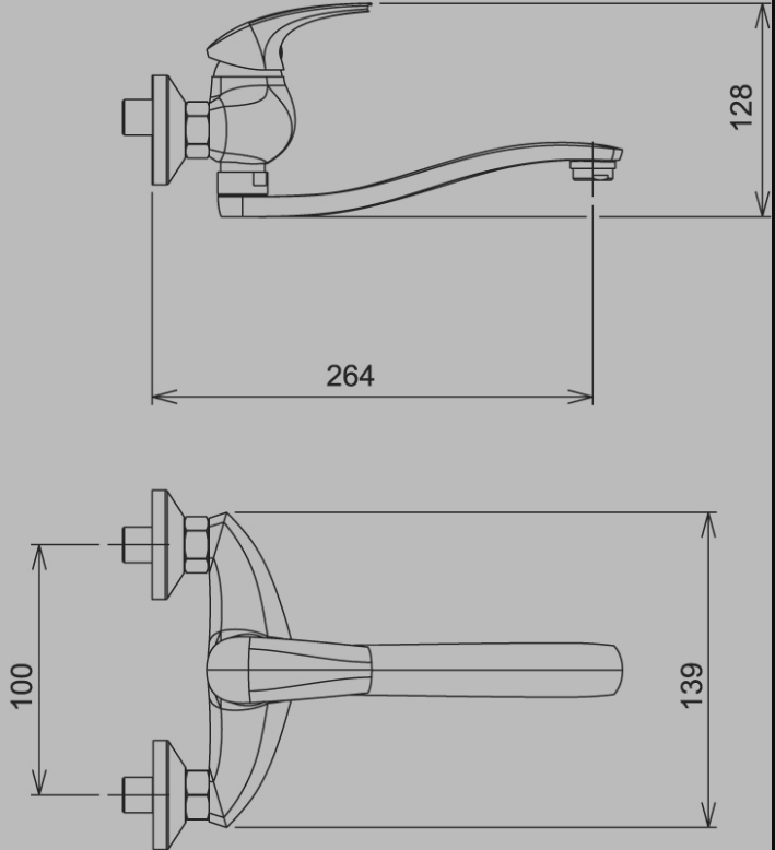 Dřezová nástěnná baterie s roztečí 100 mm a otočným ramenem s délkou 255 mm.