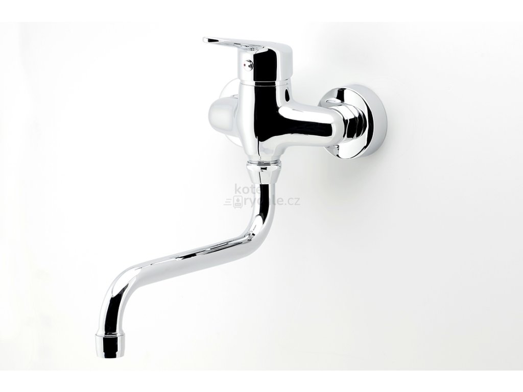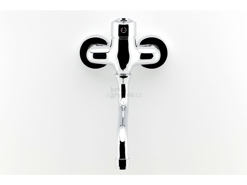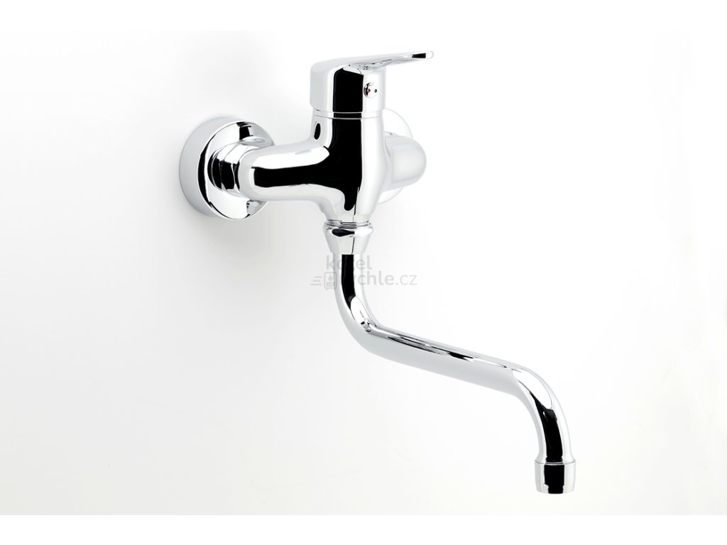 Dřezová nástěnná baterie s roztečí 100 mm a trubkovým otočným ramenem s délkou 225 mm.