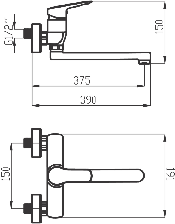 Nástěnná umyvadlová/dřezová baterie s roztečí 150 mm s plochým ramenem 350 mm.