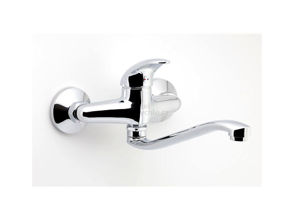 Dřezová nástěnná baterie s roztečí 150 mm a otočným ramenem s délkou 255 mm.