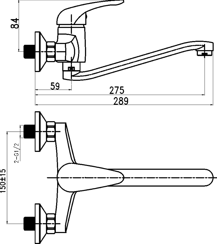 Dřezová nástěnná baterie s roztečí 150mm a elegantním otočným ramenem s délkou 255 mm.