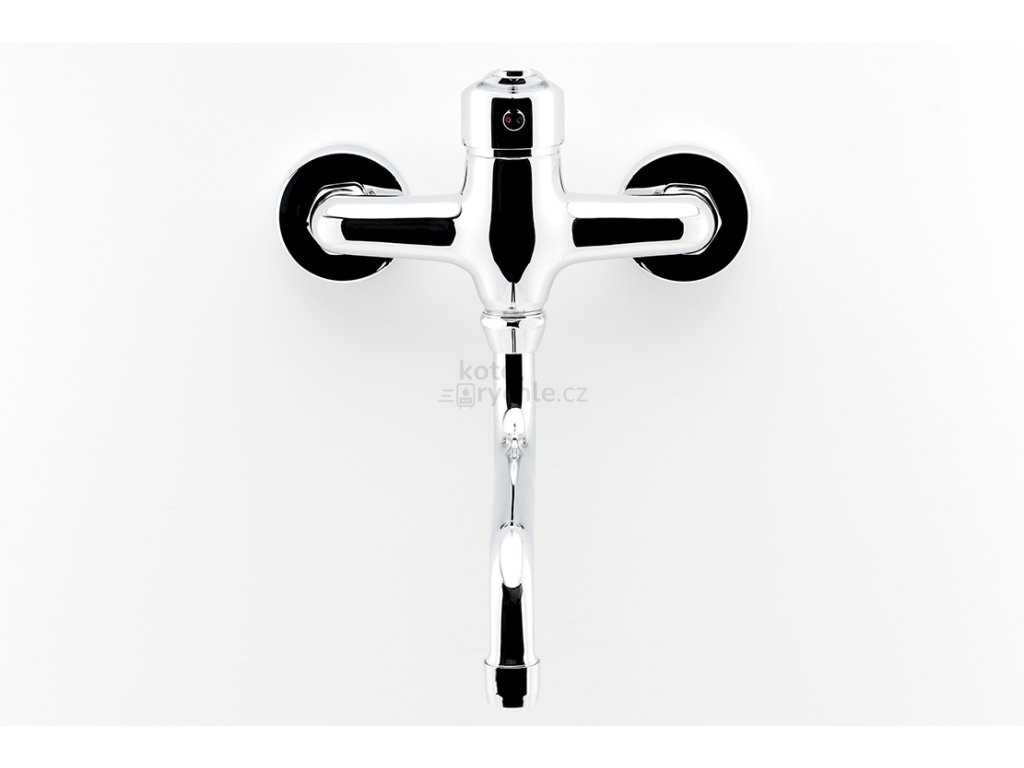 Dřezová nástěnná baterie s roztečí 150 mm a trubkovým otočným ramenem s délkou 225 mm.