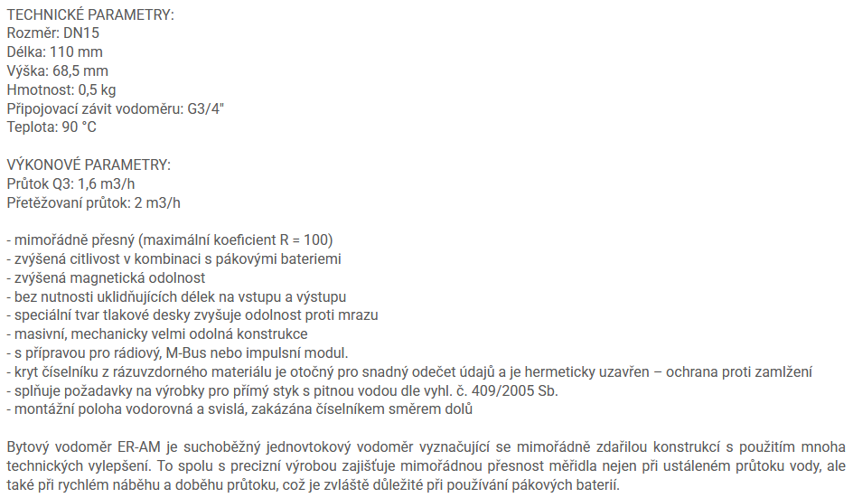 ENBRA ER-AM vodoměr bytový DN15, l=110mm, Q3=1,6m3/h suchoběžný, teplá voda 90°C, s přípravou pro rádiový, M-BuS, impulsní modul