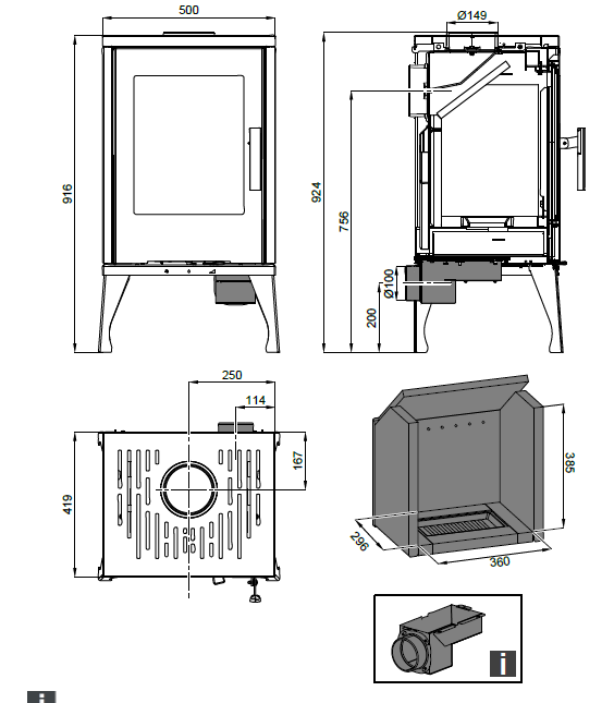 Designově jednoduchá plechová kamínka, která však splní vaše nároky. Velké prosklení umožňuje pohled do ohně, kde se do topeniště vejdou polena o velikosti 33 cm.