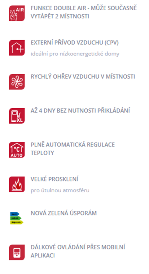 Díky ventilátoru rychle ohřejí vzduch v místnosti. S funkcí Double-Air je možné vytápět současně dvě místnosti. Čisté, bezpečné a ekologické vytápění biomasou s téměř nulovým odpadem.