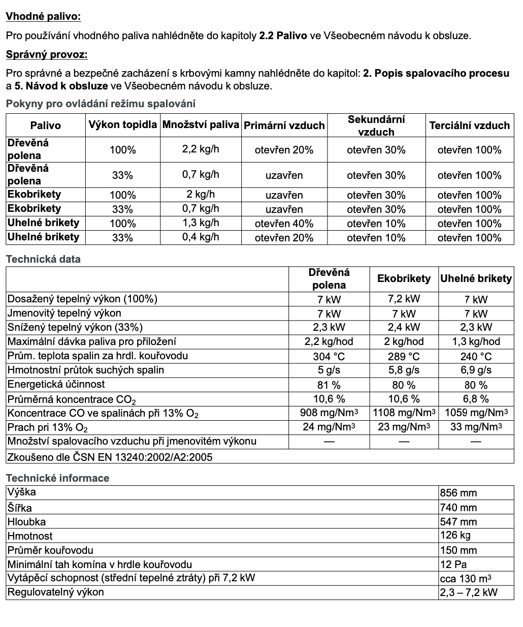 | Jmenovitý výkon kamen: | 7,2 kW |