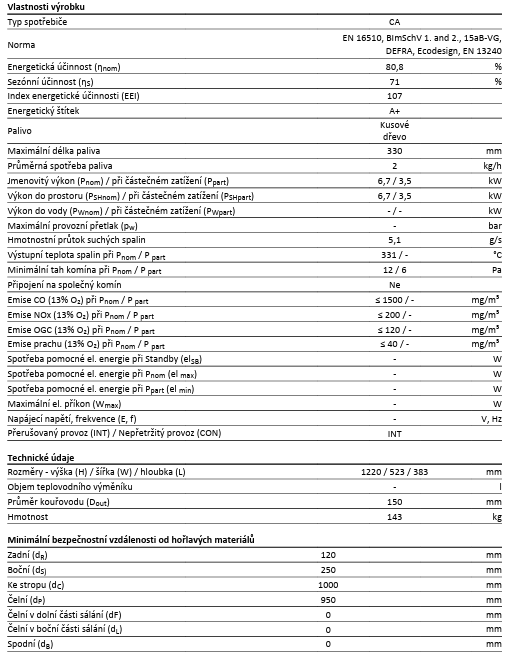 | Jmenovitý výkon kamen: | 6,7 kW |