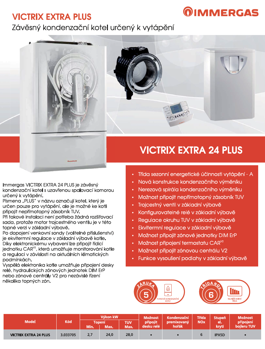 Immergas VICTRIX EXTRA 24 PLUS je nástěnný kondenzační kotel se systémem adaptivního řízení spalování o tepelném výkonu 24 kW určený k vytápění s možností ohřevu TUV v nepřímotopném stacionárním zásobníku.